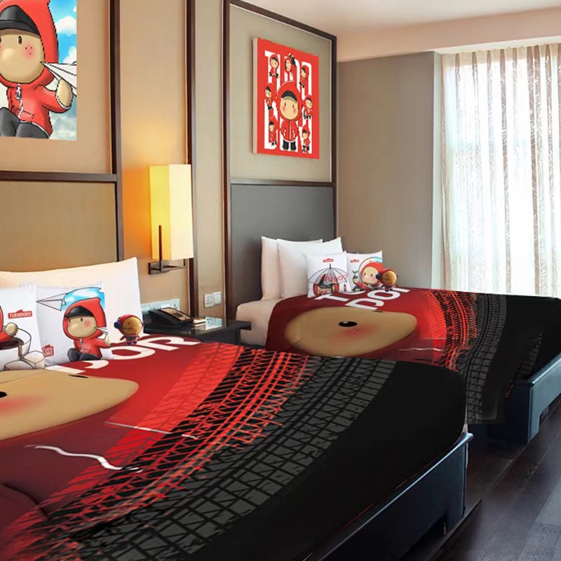 办理入住后,到达土豆多励IP亲子房,你会发现,从床罩、抱枕、儿童帐篷、壁画,甚至到浴袍、拖鞋、毛巾,都有可爱的多励点缀其中,客房内还有联名定制款土豆多励心意马克杯,每一个细节都充满着童心与趣味、梦想与温度。